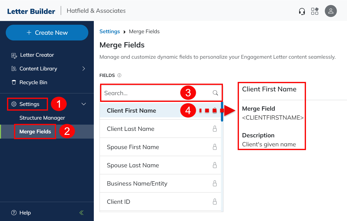 - Type into the Search field to locate a specific merge field.