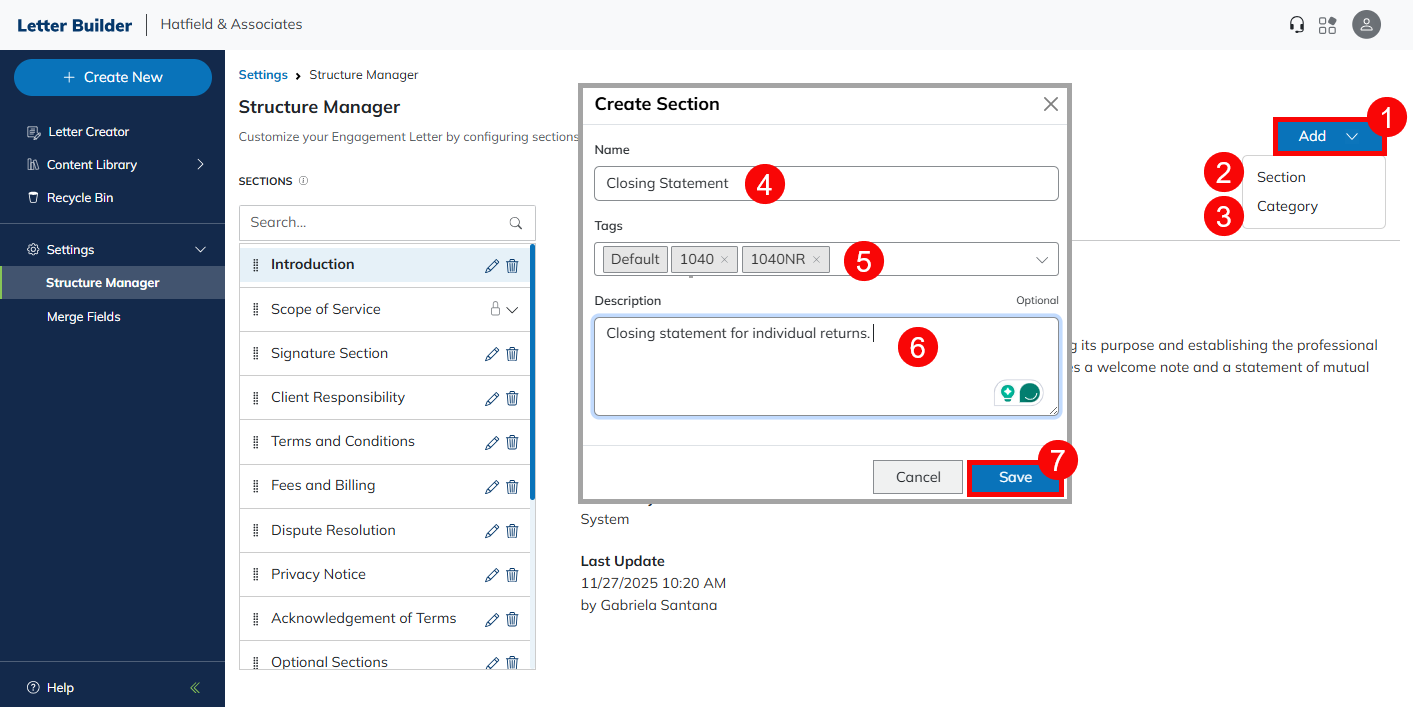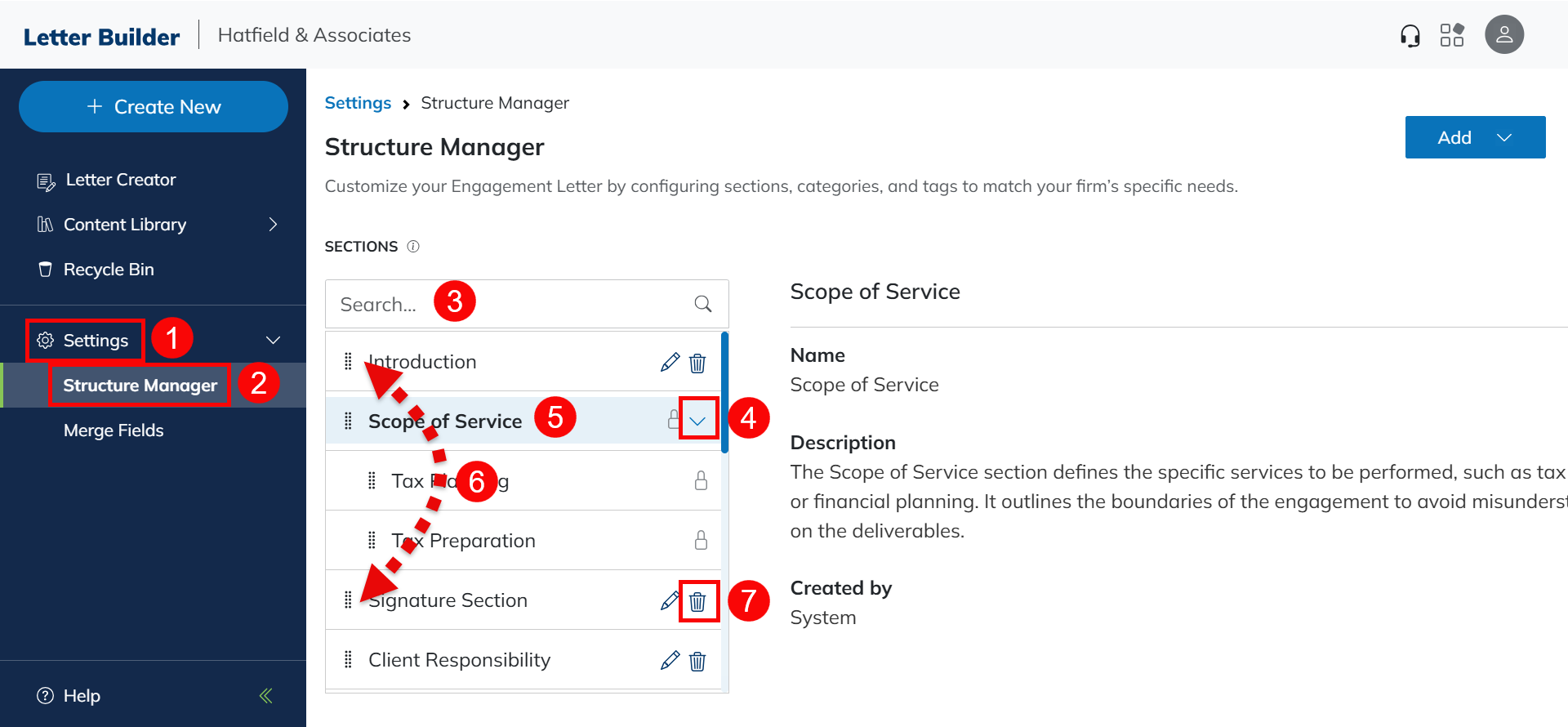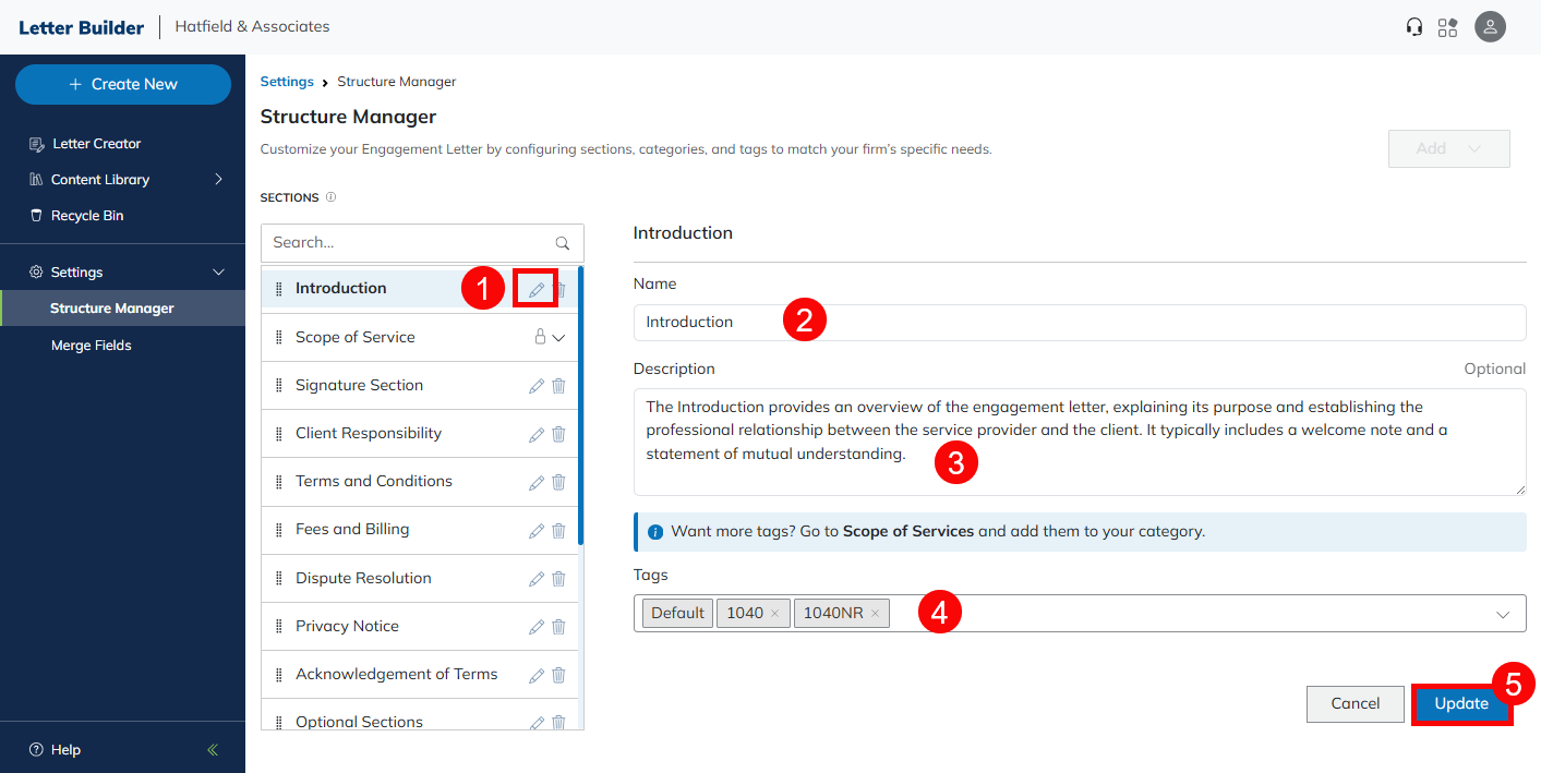 The Structure Manager allows you to customize the order in which items appear when using the Make a Custom Letter feature. You can also edit item descriptions and associated tags. See our Letter Builder Usage guide for information about that feature.