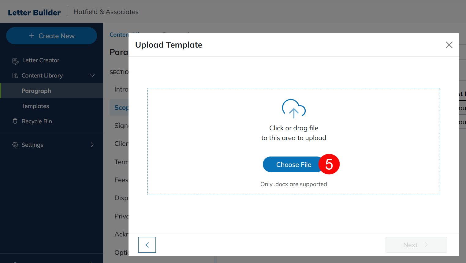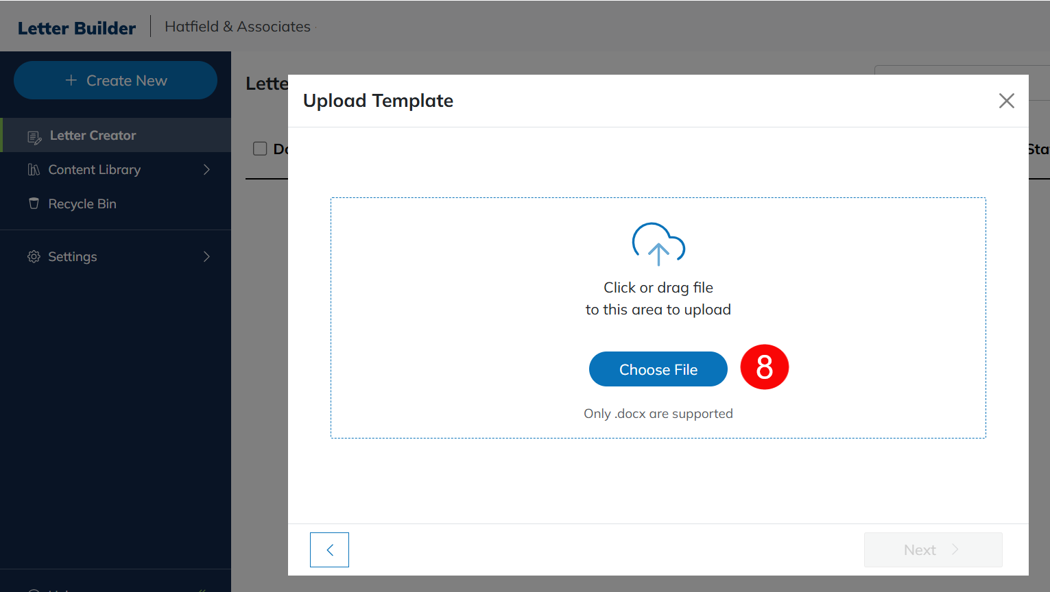 Use this option to upload an existing .docx template. You can then edit and save the template for future use. See the Edit Template section below for a full overview of template editing options.
