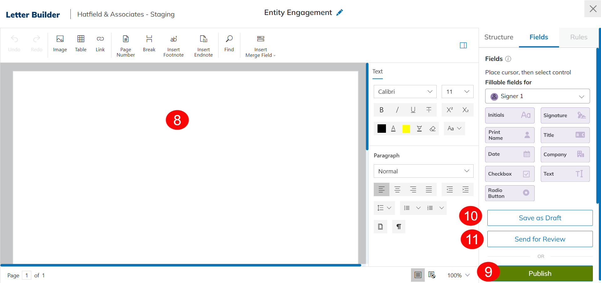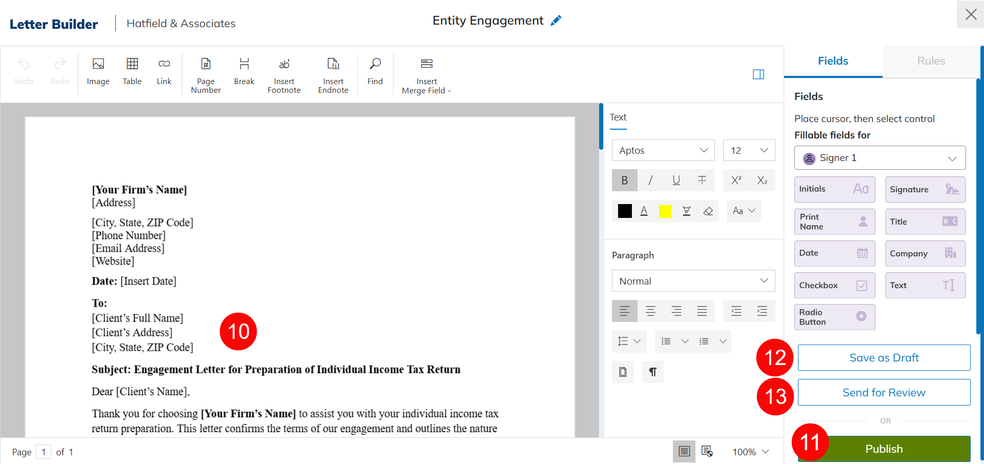 Letter Builder allows firms to save and store commonly used documents that users can send through Signatures. This article outlines how to configure letter builder settings, user permissions, and templates. See our Letter Builder Usage guide for information about sending templates through Signatures.