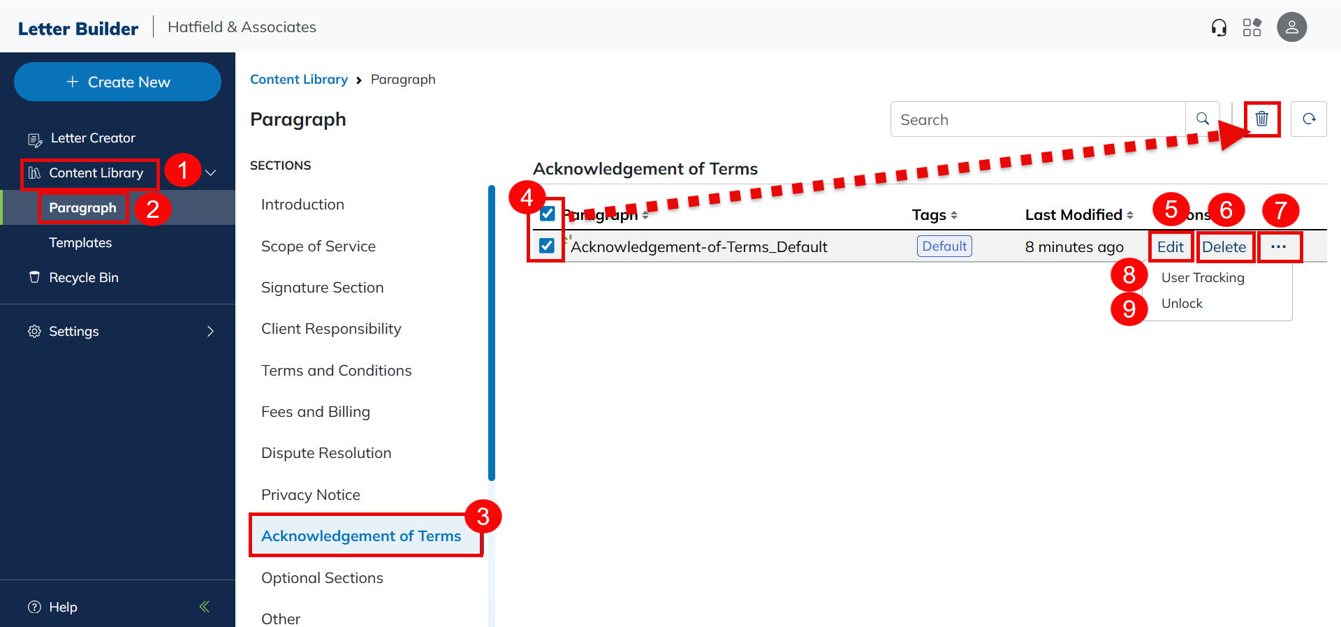 - Click the Trash Can icon to delete a section.