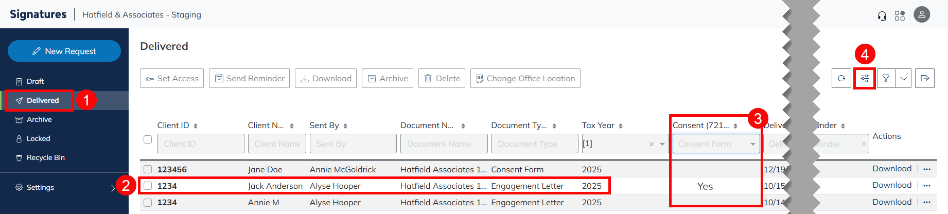 After the item is delivered and signed, you can view the client's consent status from the Signatures Delivered dashboard.