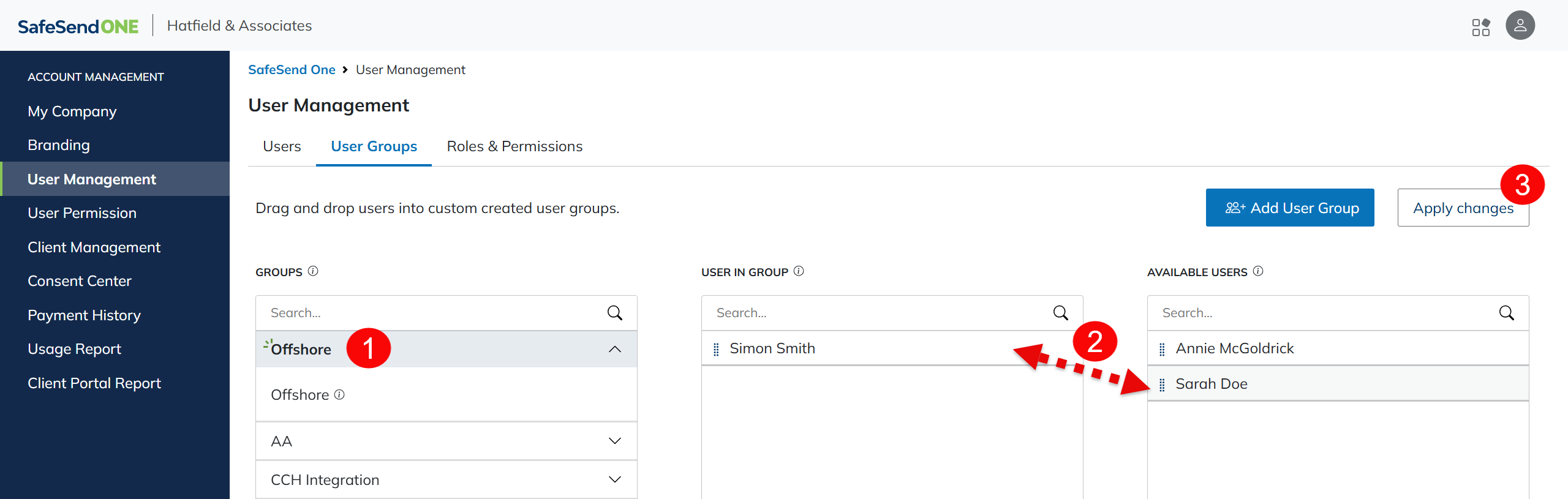 - Drag and drop users from the Available Users column to the User in Group column.